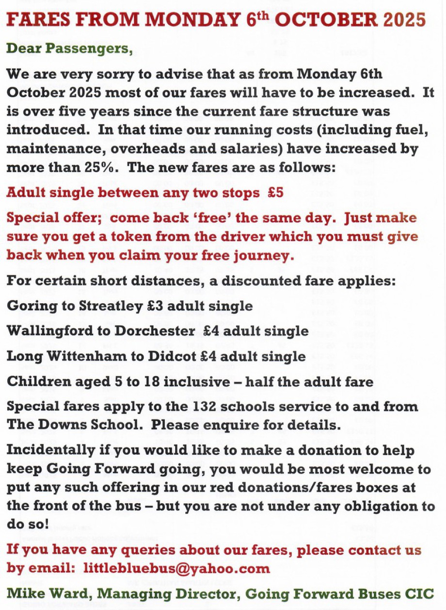 Please also note that from the start of the new 2024/2025 school year, 4th September 2024, the 07.55 Goring to Wallingford School and 15.10 Wallingford Market Place (via the School) to Goring will have a limited number of places available for non-school passengers.