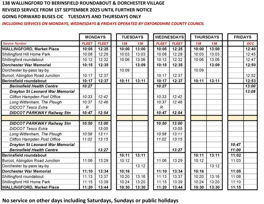 An amended timetable will be in operation from Monday September 1st 2025. Going Forward Buses will run two services to Dorchester Village via Home Park on Tuesdays and Thursdays. Oxfordshire Fleet will continue to operate on Mondays, Wednesdays and Fridays. This means there will be a service through Dorchester village five days a week, but at different times each day to and from Wallingford. On Mondays and Wednesdays the existing Oxfordshire Fleet services to and from Didcot via Long Wittenham will continue to operate.