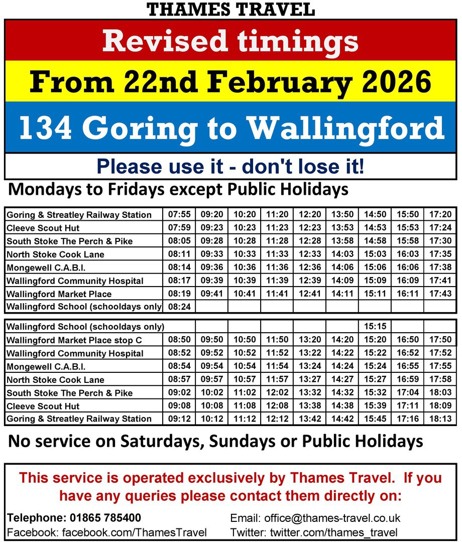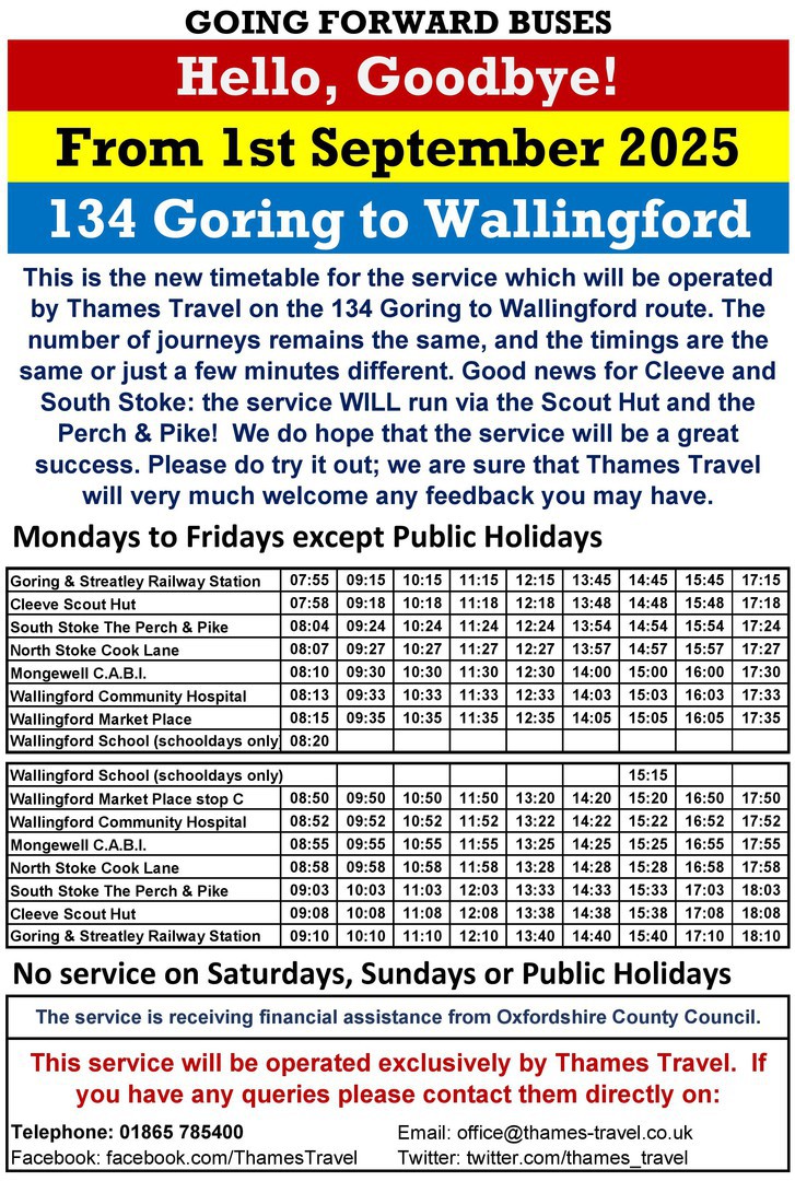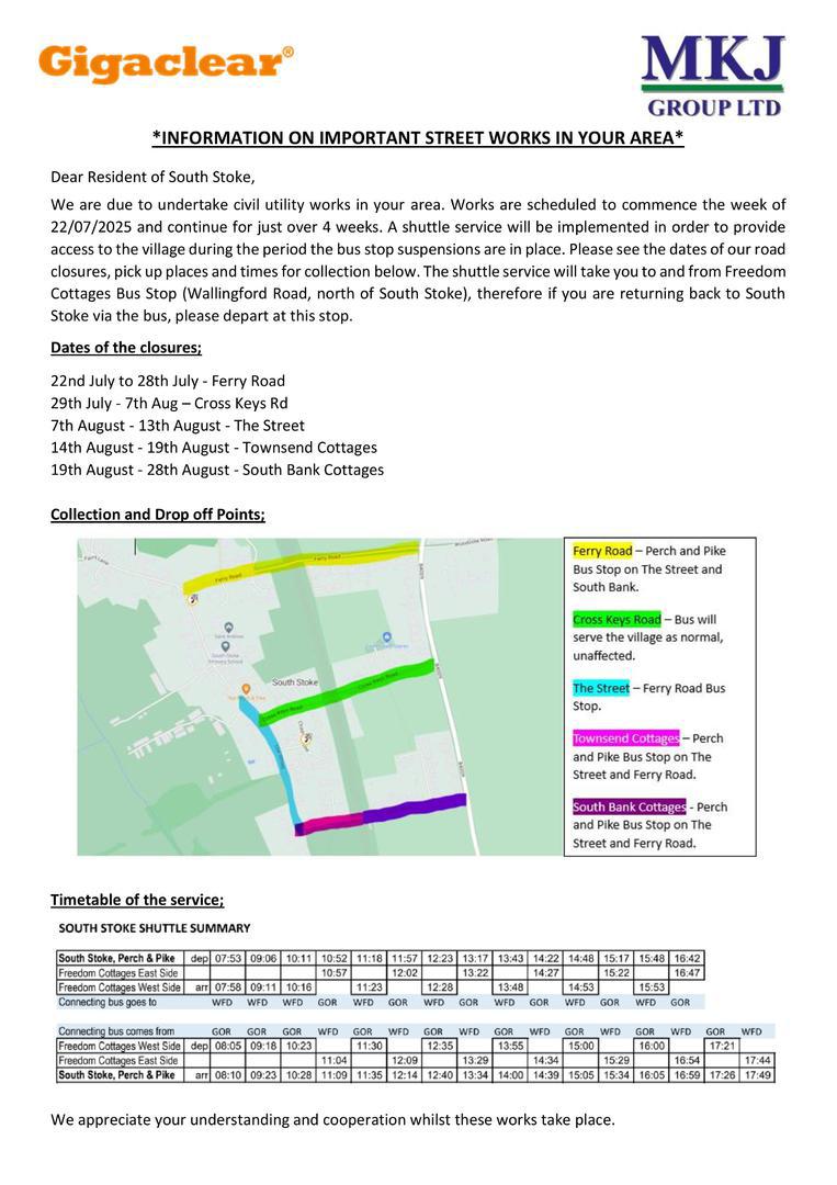 Monday 4th August 2025 for around four weeks: We are very sorry that we will be unable to serve the stops in South Stoke village while Gigaclear are working on roads used by our bus. To help passengers who can't walk up to the stops on the main road a taxi shuttle will be provided. We apologise to our South Stoke passengers for any confusion. If at all possible we recommend you try to use the stops at Freedom Cottages just north of the crossroads on the B4009, or wait on the corner at the junction of South Bank and the B4009 so that we will be able to pick you up there. If you're not sure where you should be waiting, please do call us on 07484 605888 and we will do our best to help.
