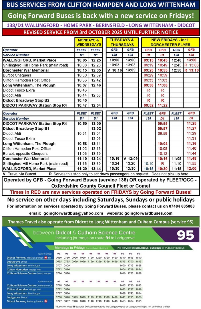 NEW on Fridays from 3rd October 2025, Going Forward Buses is back with a shoppers service to Didcot from Dorchester, Clifton Hampden and Long Wittenham! The new timetable for the revised Autumn 2025 service on this route is shown below. Oxforshire Fleet Services will continue to operate on Mondays and Wednesdays. The timetable for Thames Travel service 95 which operates at peak hours is also shown below.