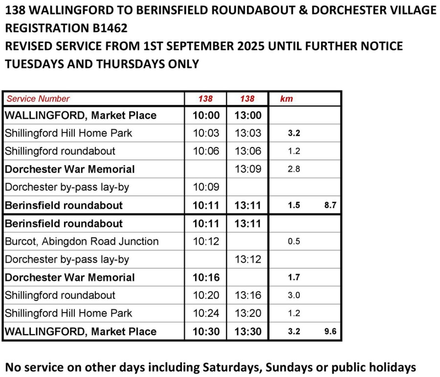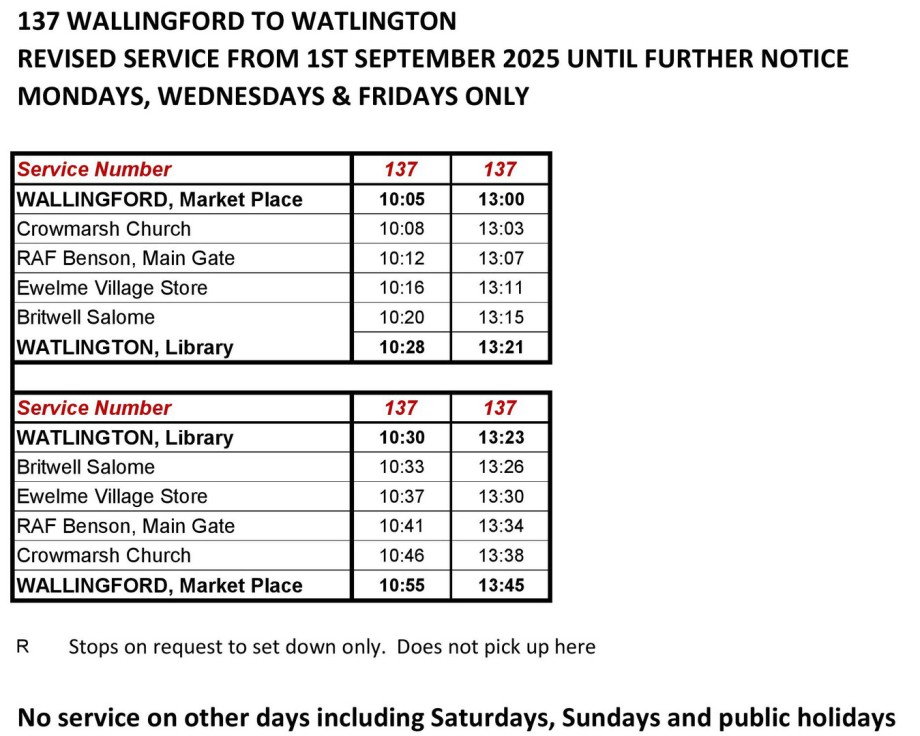 Details of the services we will be operating from September 1st 2025 are shown below. We will be running services on routes 133, 137 and 138 and on two NEW routes - Woodcote to Compton via Goring and a town service for Wallingford. We look forward to welcoming you on board! The 134 Goring to Wallingford service will be operated by Thames Travel from 1st September - their new timetable is also shown below.