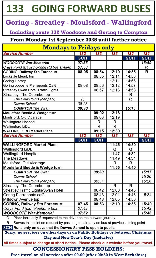 Below is the timetable for our NEW Woodcote - Goring - Compton (for The Downs School) service. Accommodation is limited to the number of seats on the bus: schoolchildren who have reserved seats for the current time have priority. It may not be possible to convey other passengers.