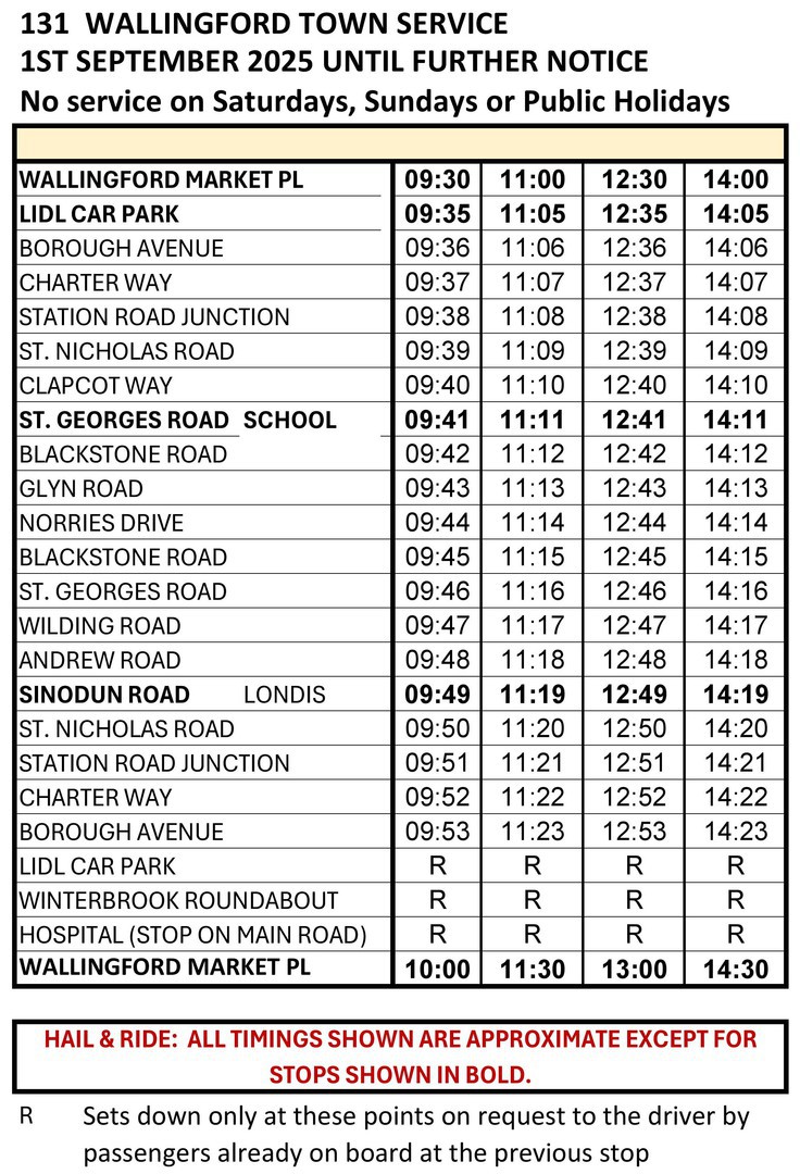 Below is the timetable for our NEW Wallingford Town service. This is an experimental service, with four circular journeys running round the town serving LiDL and the Market Place for shopping and connections to other buses. Please use it - and let us know what you think!